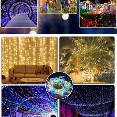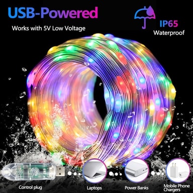 10M 100 LED USB dreamcolor lyslenke med Bluetooth app-kontroll og 24-tasters fjernkontroll. IP67 vanntett, musikksynkronisering, stemmestyring, 5050 LED-perler, perfekt for innendørs/utendørs dekorasjon.Les mer om produktet