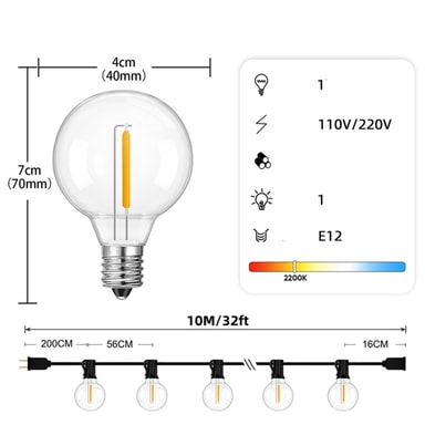 Har 10 meter lyslenke med 15 E12 sokkel LED-pærer.