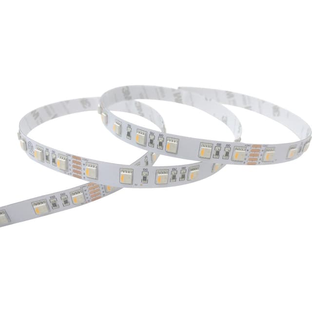 LED strip fra Namron 5m RGBW med tilhørende Tilbehør: 2 stk ekstra hurtigtilkoblinger på 30cm, 2 stk Hurtigskjøter på 15cm og 2 stk Hurtigskjøter. 600lm/m, RGB, IP20.Les mer om produktet