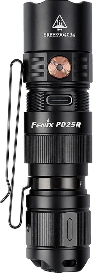 PD25R er full av toppfunksjoner som skiller den fra konkurrentene. Med klassens beste forhold mellom størrelse og effekt og en svimlende rekkevidde på 250 meter er dette noe som aldri før er sett i en lampe av denne størrelsen. USB C-ladekontakten med EU-standard lader raskt opp lampen til full effekt. Den lange, toveis Deep Pocket Clip med titanbelagt metallklips gjør det mulig å bruke den selv i en magasinveske. To trykknappbrytere gjør det intuitivt og enkelt å bruke lampen. Hovedbryteren har en funksjon for øyeblikkelig påslåing. Utskiftbart 16340 Li-ion Power-batteri (inkludert), med mulighet for å bruke et CR123A-batteri med høy kuldebestandighet (tilgjengelig separat). Blendende strobelys på 800 lumen for selvforsvar eller signalering.