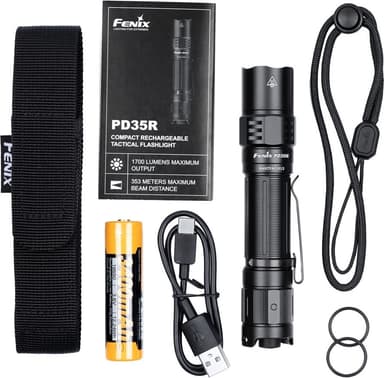 Fenix PD35R er en kompakt og kraftig oppladbar lommelykt som erstatter den populære UC35 V2.0. Blendende maks. 1700 lumen lysstyrke og en lang rekkevidde på maks. pD35R er den kompakte lommelykten med en lysstråle som strekker seg opptil 353 meter. PD35R er rask og enkel å bruke med to trykknapper på toppen. Den store trykknappen slår på lyset, og den mindre knappen veksler mellom ulike lysstyrkemoduser. PD35R lades via en USB C-ladekontakt med EU-standard. Fenix PD35R er utviklet for krevende hobbybrukere, myndigheter, villmarks- og campingbruk når du trenger en svært kompakt, slitesterk og pålitelig lommelykt uten at det går på bekostning av ytelsen.