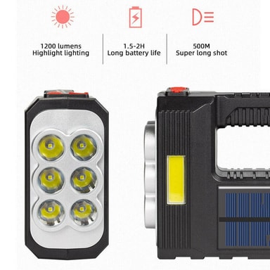 Kraftig lommelykt med 8 LED-lamper og en LED-lampe på siden. Lommelykten har også en utgang der du i nødstilfeller kan lade enhetene dine.Les mer om produktet
