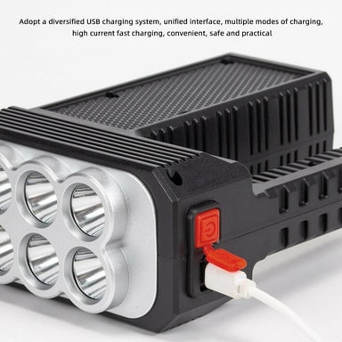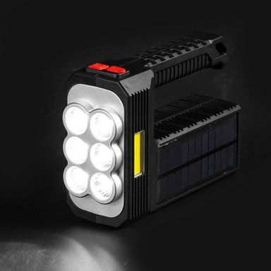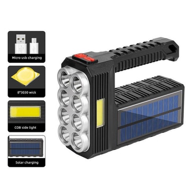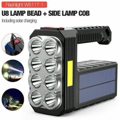 Kraftig lommelykt med 8 LED-lamper og en LED-lampe på siden. Lommelykten har også en utgang der du i nødstilfeller kan lade enhetene dine. Perfekt for camping og fotturer.