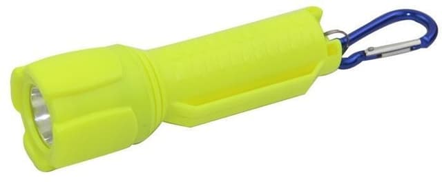 Lommelykten kommer i en neongul farge og har en karabinkrok som gjør det enkelt å feste lommelykten.