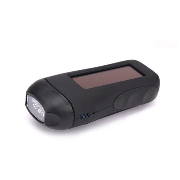 En kraftig lommelykt som kan lades enten via USB-kabel, håndsveiv eller solcellepanel.