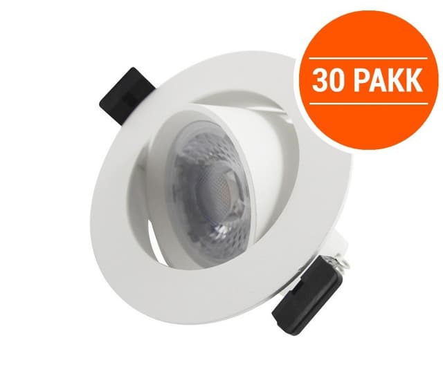 30 Pakkning Pen lavtbyggende downlight på 10W som kan dimmes ned flimmer fritt. Lampen kan tiltes 35 grader. Lysstyrke på 700 lm og en RA verdi på 95+ gir et godt lys med en god fargegjengivelse.Teknisk beskrivelse: 10W 230V. IP44. RA 95+. 700 lm.
