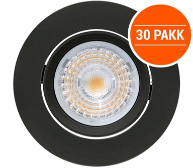 30 pakk Pen lavtbyggende downlight med tilt og som kan dimmes ned flimmerfritt. Rent design og materiale i høy kvalitet som er designet for tøffe forhold.Teknisk beskrivelse: • Lysstyrke: 700 lm. • Effekt: 10W. • Kapslingsgrad: IP44. Montering: Leveres med ekstern driver med hutigkobling for rask montering. Monteres uten verktøy. Spesifikasjoner: