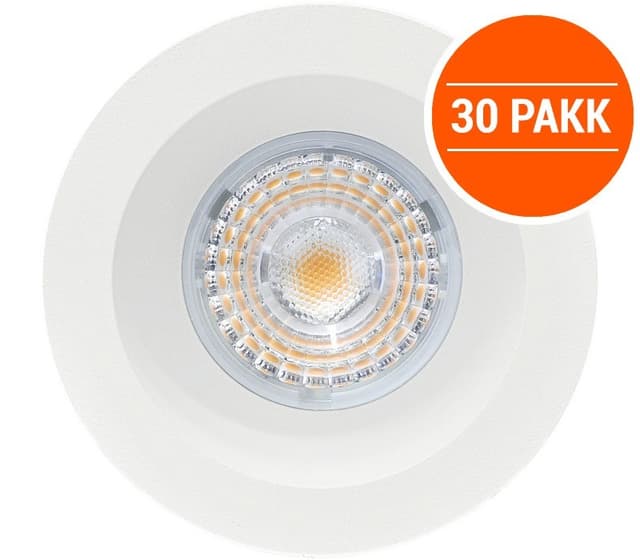 30 pakk Alfa Soft LED er en pen lavtbyggende downlight som kan dimmes ned flimmerfritt. Inntrukket lyskilde gir god komfort og hindrer blending. Utførelse i matt hvit.Teknisk beskrivelse: RA verdi på 95+ gir et godt lys med en god fargegjengivelse. Montering: Ekstern driver med hurtigkobling for raskere og enklere installasjon. Denne lampen passer inn i hull med en diameter på 82-84 mm. Monteres uten verktøy. Spesifikasjoner: