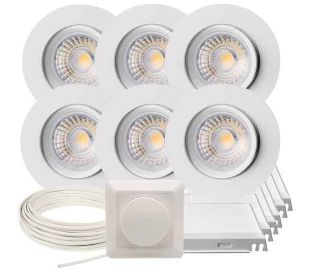 Komplett Alfa 360-tilt downlightspakke med det du trenger for å montere 6 stk. Alfa downlights. Settet inneholder: 6 x Alfa 360-tilt Downlight 8W matt hvit, IP44. LED-downlight i matt hvit med integrert linse med 600 lm på 8W. Lyset kan dimmes helt ned flimmerfritt og har en lav profil. Kan roteres i alle retninger og tiltes opptil 25 grader. 6 x Lavtbyggende og justerbar innfellingsboks for downlight fra Namron Kan justeres fra 370mm til 570mm. Høyde på kasse: 48mm. 1 x Downlightkabel RXKX 90 2X1,5 Snelle 25M Kabel for downlightanlegg med lederisolasjon og ytre kappe av blyfri PVC for maksimal driftstemperatur 90 °C. RXKX 90 er spesielt beregnet for downlight-belysning. 1 x Dimmer 250W 1-pol fra Namron 1-pol trykk og vri dimmer faseavsnitt som er egnet for LED, elektroniske trafoer og 230V halogen. Beskyttet mot kortslutning, overstrøm og overoppheting.Bruksområde: For bruk i de fleste rom hvor det ønskes god belysning. Montering: Hurtigkoblinger tilkobles før lampen settes inn. Spesifikasjoner: