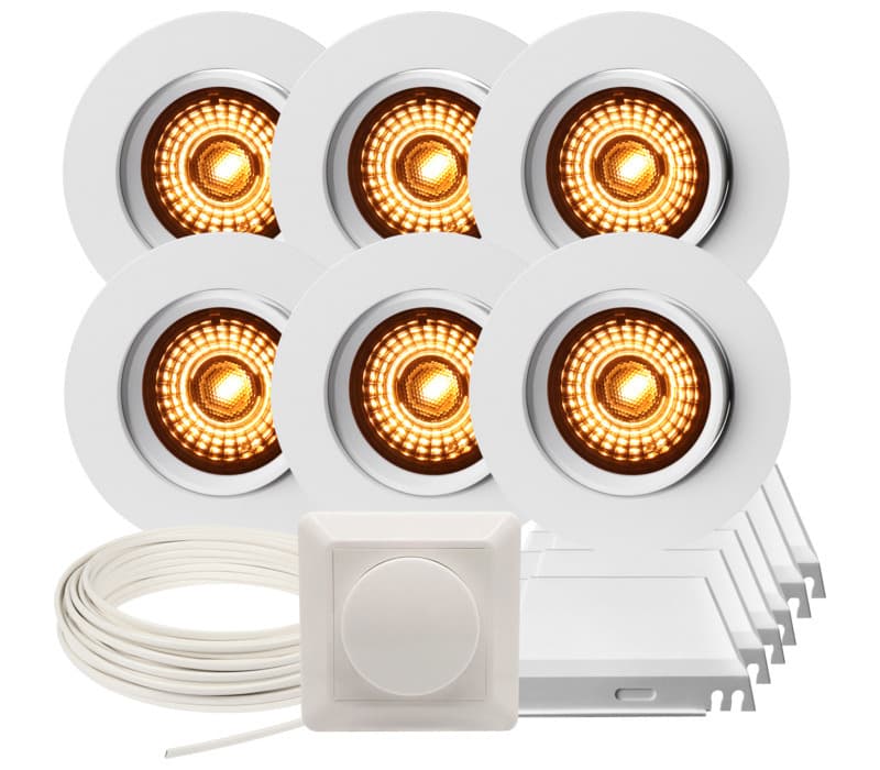 Komplett Alfa 360-tilt Warmdim downlightspakke med det du trenger for å montere 6 stk. Alfa downlights. Settet inneholder: 6 x Alfa 360-tilt Downlight Warmdim 8W matt hvit, IP44. LED-downlight med WarmDim, 520 lm på 8W. Lyset kan dimmes helt ned flimmerfritt og har en lav profil. Kan roteres i alle retninger og tiltes opptil 20 grader. 6 x Lavtbyggende og justerbar innfellingsboks for downlight fra Namron Kan justeres fra 370mm til 570mm. Høyde på kasse: 48mm. 1 x Downlightkabel RXKX 90 2X1,5 Snelle 25M Kabel for downlightanlegg med lederisolasjon og ytre kappe av blyfri PVC for maksimal driftstemperatur 90 °C. RXKX 90 er spesielt beregnet for downlight-belysning. 1 x Dimmer 250W 1-pol fra Namron 1-pol trykk og vri dimmer faseavsnitt som er egnet for LED, elektroniske trafoer og 230V halogen. Beskyttet mot kortslutning, overstrøm og overoppheting.Bruksområde: For bruk i de fleste rom hvor det ønskes god belysning. Montering: Hurtigkoblinger tilkobles før lampen settes inn. Spesifikasjoner: