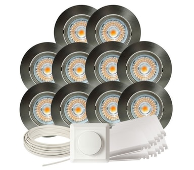 Komplett Alfa Tilt LED downlightspakke med det du trenger for å montere 10 stk. Alfa downlights. Settet inneholder: 10 x Alfa Tilt LED Downlight 10W Børstet stål, IP44. Solid og stilig downlight. Downlighten kan dimmes ned helt flimmerfritt. Lav høyde. Ekstern driver med hurtigkobling for raskere og enklere installasjon. 700 lm. Utsparring: Ø82-84 mm. ØxH: 95x40 mm. 10 x Lavtbyggende og justerbar innfellingsboks for downlight fra Namron Kan justeres fra 370mm til 570mm. Høyde på kasse: 48mm. 1 x Downlightkabel RXKX 90 2X1,5 Snelle 25M Kabel for downlightanlegg med lederisolasjon og ytre kappe av blyfri PVC for maksimal driftstemperatur 90 °C. RXKX 90 er spesielt beregnet for downlight-belysning. 1 x Dimmer 250W 1-pol fra Namron 1-pol trykk og vri dimmer faseavsnitt som er egnet for LED, elektroniske trafoer og 230V halogen. Beskyttet mot kortslutning, overstrøm og overoppheting.Bruksområde: For bruk i de fleste rom hvor det ønskes god belysning. Montering: Hurtigkoblinger tilkobles før lampen settes inn. Spesifikasjoner: