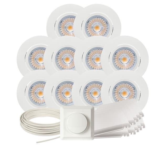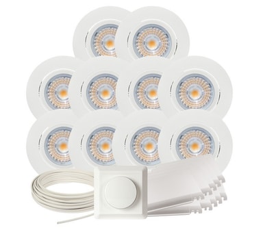 Komplett Alfa Tilt LED downlightspakke med det du trenger for å montere 10 stk. Alfa downlights. Settet inneholder: 10 x Alfa Tilt LED Downlight 10W Matt Hvit, IP44. Solid og stilig downlight. Downlighten kan dimmes ned helt flimmerfritt. Lav høyde. Ekstern driver med hurtigkobling for raskere og enklere installasjon. 700 lm. Utsparring: Ø82-84 mm. ØxH: 95x40 mm. 10 x Lavtbyggende og justerbar innfellingsboks for downlight fra Namron Kan justeres fra 370mm til 570mm. Høyde på kasse: 48mm. 1 x Downlightkabel RXKX 90 2X1,5 Snelle 25M Kabel for downlightanlegg med lederisolasjon og ytre kappe av blyfri PVC for maksimal driftstemperatur 90 °C. RXKX 90 er spesielt beregnet for downlight-belysning. 1 x Dimmer 250W 1-pol fra Namron 1-pol trykk og vri dimmer faseavsnitt som er egnet for LED, elektroniske trafoer og 230V halogen. Beskyttet mot kortslutning, overstrøm og overoppheting.Bruksområde: For bruk i de fleste rom hvor det ønskes god belysning. Montering: Hurtigkoblinger tilkobles før lampen settes inn. Spesifikasjoner: