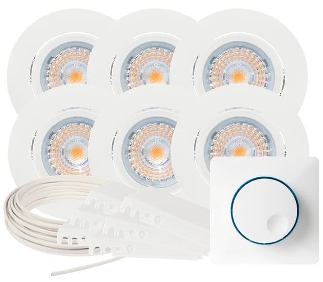 Komplett alfa downlightspakke med det du trenger for å montere 6 stk. Alfa downlights. settet inneholder: 6 x alfa led 10w i matt hvit, ip44. Pen lavtbyggende downlight som kan dimmes helt ned flimmer fritt og tiltes 35 grader. 700 lm og en ra verdi på 95+ gir et godt lys med en god fargegjengivelse. Utsparring: 82-84 mm. Øxh: 95x40 mm. 6 x lavtbyggende og justerbar innfellingsboks for downlight fra namron kan justeres fra 370mm til 570mm. Høyde på kasse: 48mm. 1 x downlightkabel rxkx 90 2x1,5 snelle 25m kabel for downlightanlegg med lederisolasjon og ytre kappe av blyfri pvc for maksimal driftstemperatur 90 °c. Rxkx 90 er spesielt beregnet for downlight-belysning. 1 x unilamp widim 250 dimmer 2-250w universal 1-pol trykk/vri veggdimmer med core2dim system. For bruk med led, elektroniske trafoer, glødelamper og 230v halogen. Kan styres med trykk/vri på vanlig måte, men den kan også fjernstyres fra widim-appen på mobil/nettbrett.bruksområde: for bruk i de fleste rom hvor det ønskes god belysning. montering: hurtigkoblinger tilkobles før lampen settes inn. spesifikasjoner:
