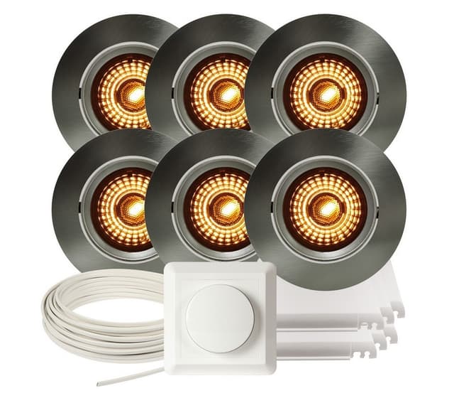 Komplett Alfa WarmDim downlightspakke med det du trenger for å montere 6 stk. Alfa downlights. Settet inneholder: 6 x Alfa WarmDim Downlight 10W Børstet stål, IP44. Solid og stilig downlight. Downlighten kan dimmes ned helt flimmerfritt. Lav høyde. Ekstern driver med hurtigkobling for raskere og enklere installasjon. 610 lm. Utsparring: Ø82-84 mm. ØxH: 95x40 mm. 6 x Lavtbyggende og justerbar innfellingsboks for downlight fra Namron Kan justeres fra 370mm til 570mm. Høyde på kasse: 48mm. 1 x Downlightkabel RXKX 90 2X1,5 Snelle 25M Kabel for downlightanlegg med lederisolasjon og ytre kappe av blyfri PVC for maksimal driftstemperatur 90 °C. RXKX 90 er spesielt beregnet for downlight-belysning. 1 x Dimmer 250W 1-pol fra Namron 1-pol trykk og vri dimmer faseavsnitt som er egnet for LED, elektroniske trafoer og 230V halogen. Beskyttet mot kortslutning, overstrøm og overoppheting.Bruksområde: For bruk i de fleste rom hvor det ønskes god belysning. Montering: Hurtigkoblinger tilkobles før lampen settes inn. Spesifikasjoner: