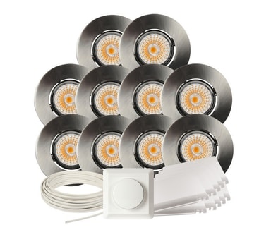 Komplett Altea Tilt LED downlightspakke med det du trenger for å montere 10 stk. Altea downlights. Settet inneholder: 10 x Altea Tilt LED Downlight 8W Børstet Stål, IP20. Solid og stilig downlight. Downlighten kan dimmes ned helt flimmerfritt. Lav høyde. Ekstern driver med hurtigkobling for raskere og enklere installasjon. 550 lm. Utsparring: 76 mm. ØxH: 89x50,5 mm. 10 x Lavtbyggende og justerbar innfellingsboks for downlight fra Namron Kan justeres fra 370mm til 570mm. Høyde på kasse: 48mm. 1 x Downlightkabel RXKX 90 2X1,5 Snelle 25M Kabel for downlightanlegg med lederisolasjon og ytre kappe av blyfri PVC for maksimal driftstemperatur 90 °C. RXKX 90 er spesielt beregnet for downlight-belysning. 1 x Dimmer 250W 1-pol fra Namron 1-pol trykk og vri dimmer faseavsnitt som er egnet for LED, elektroniske trafoer og 230V halogen. Beskyttet mot kortslutning, overstrøm og overoppheting.Bruksområde: For bruk i de fleste rom hvor det ønskes god belysning Montering: Hurtigkoblinger tilkobles før lampen settes inn. Spesifikasjoner: