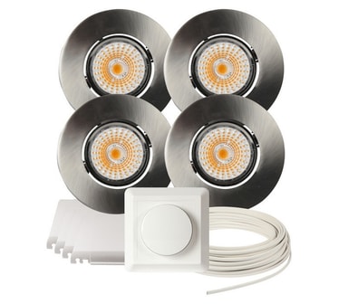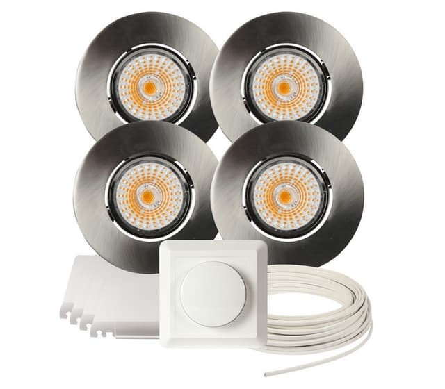 Komplett Altea Tilt LED downlightspakke med det du trenger for å montere 4 stk. Altea downlights. Settet inneholder: 4 x Altea Tilt LED Downlight 8W Matt Hvit, IP20. Solid og stilig downlight. Downlighten kan dimmes ned helt flimmerfritt. Lav høyde. Ekstern driver med hurtigkobling for raskere og enklere installasjon. 550 lm. Utsparring: 76 mm. ØxH: 89x50,5 mm. 4 x Lavtbyggende og justerbar innfellingsboks for downlight fra Namron Kan justeres fra 370mm til 570mm. Høyde på kasse: 48mm. 1 x Downlightkabel RXKX 90 2X1,5 Snelle 25M Kabel for downlightanlegg med lederisolasjon og ytre kappe av blyfri PVC for maksimal driftstemperatur 90 °C. RXKX 90 er spesielt beregnet for downlight-belysning. 1 x Dimmer 250W 1-pol fra Namron 1-pol trykk og vri dimmer faseavsnitt som er egnet for LED, elektroniske trafoer og 230V halogen. Beskyttet mot kortslutning, overstrøm og overoppheting.Bruksområde: For bruk i de fleste rom hvor det ønskes god belysning. Montering: Hurtigkoblinger tilkobles før lampen settes inn. Spesifikasjoner: