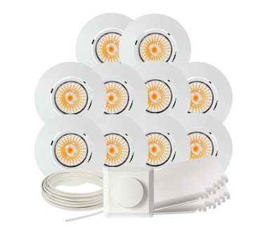 Komplett Altea Tilt LED downlightspakke med det du trenger for å montere 10 stk. Altea downlights. Settet inneholder: 10 x Altea Tilt LED Downlight 8W Matt Hvit, IP20. Solid og stilig downlight. Downlighten kan dimmes ned helt flimmerfritt. Lav høyde. Ekstern driver med hurtigkobling for raskere og enklere installasjon. 550 lm. Utsparring: 76 mm. ØxH: 89x50,5 mm. 10 x Lavtbyggende og justerbar innfellingsboks for downlight fra Namron Kan justeres fra 370mm til 570mm. Høyde på kasse: 48mm. 1 x Downlightkabel RXKX 90 2X1,5 Snelle 25M Kabel for downlightanlegg med lederisolasjon og ytre kappe av blyfri PVC for maksimal driftstemperatur 90 °C. RXKX 90 er spesielt beregnet for downlight-belysning. 1 x Dimmer 250W 1-pol fra Namron 1-pol trykk og vri dimmer faseavsnitt som er egnet for LED, elektroniske trafoer og 230V halogen. Beskyttet mot kortslutning, overstrøm og overoppheting.Bruksområde: For bruk i de fleste rom hvor det ønskes god belysning. Montering: Hurtigkoblinger tilkobles før lampen settes inn. Spesifikasjoner: