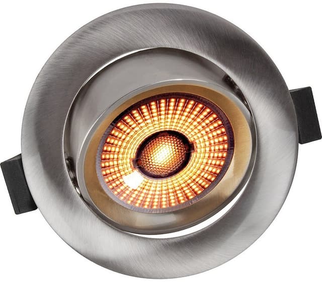 Downlight i børstet stål fra unilamp på 10 w. Dette er en meget lavtbyggende (kun 34 mm innfellingsdybde) downlight med en inntrukket led lyskilde som kan tiltes opptil 30 grader. Med warmdim som skaper et varmt og hyggelig lys når det dimmes ned, trinnløst og flimmerfritt fra 3000 ned til 2000k.teknisk beskrivelse: lysstyrke 650 lm. 350 ma dimbar driver. Ra 95 bruksområde: for innendørs og utendørs bruk, sprutsikker (ip 44). montering: leveres komplett med ekstern led driver ferdig kablet mellom armatur og driver. Felles inn i tak med en utsparing på 82-84 mm. spesifikasjoner: