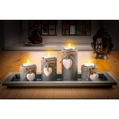 - Sett med 3 hvite LED-lys (hver 3,8 x 3,7 cm) - Unik flammeeffekt og ekte voksbelegg - kan knapt skilles fra ekte stearinlys - Med timerfunksjon - 6 timer på / 18 timer av - Kan brukes der ekte lys er for farlige eller ikke tillatt - batteridrevet 1 x 3 V CR2032 litiumknappcelle hver (4 stk inkludert i leveransen) - Merk: Beskytt mot ekstrem varme og sterkt sollys, ellers vil lysene smelte