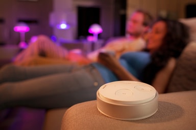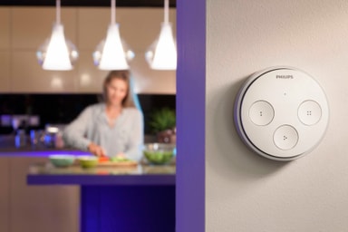 Du kan enkelt styre alle dine Hue-lamper med den trådløse Philips smart tap-bryteren når telefonen står til lading eller når barna leker med nettbrettet.