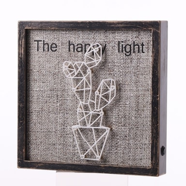 Happy Light kombinerer form og funksjon på en unik og vakker måte. Stoffbakgrunnen sammen med den litt slitte rammen gir et hjemlig og koselig inntrykk, noe som gjør at tavlen passer godt inn i de fleste hjem. Når mørket faller på, kan du slå på belysningen i produktet, som gir et mykt, varmt hvitt lys og lyser opp kaktusmotivet. De små LED-lyspunktene er festet på ulike steder inne i kaktusen på en diskret måte som gjør at de knapt er synlige når lyset er slått av, men som lyser opp hele tavlen og skaper en koselig atmosfære i hele rommet. Irritasjonsfri interiørdesign