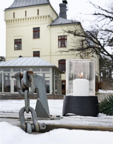 Detta är en gedigen pjäs med skön tyngd. Foten är helt i gjutjärn och kåpan i glas. Snygg som den är eller lägg lite dekoration runt ljuset på botten för att förhöja stämningen.