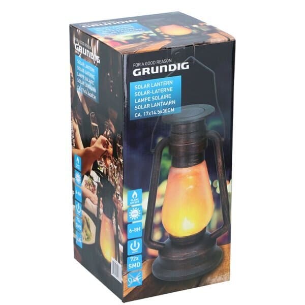 En solcellelykt som sørger for at den blir opplyst i hagen med en flammeeffekt som gir hagen liv om kvelden. På dagtid lagrer lampen energi og den begynner å lyse automatisk når mørket har senket seg i ca 6-8 timer med fulladede batterier. Det er en av og på-knapp slik at du bestemmer når den skal være på og ikke.