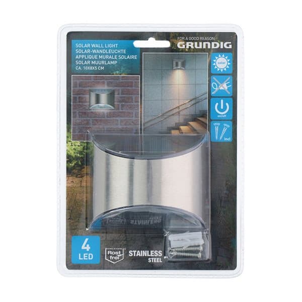 En moderne design i slitesterkt rustfritt stål. Denne moderne utendørslampen fra Grundig drives av solenergi. Det er et solcellepanel på toppen. Om dagen får den energi fra sollys, og om kvelden lyser den opp av seg selv. Den skinner nedover og er derfor ideell for å henge over inngangsdøren eller ved en trapp.
