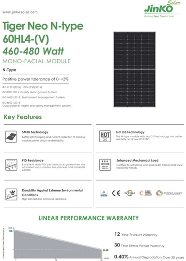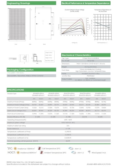 Spesifikasjoner: * SMBB Teknologi * 22,01% moduleffektivitet * Hot 2.0 Technology * 120 Monokrystallinske celler * PID Resistance * Vindlast: 2400 Pascal, Snølast: 5400 Pascal (test load) * Connector: Jinko JK03M2 - Designet for å passe Staübli MC4 Evo 2 Se under linker for detaljert informasjon