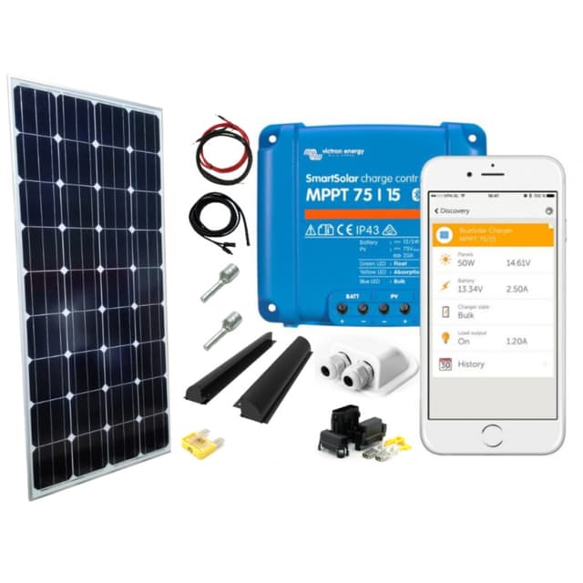 1 stk. Solcellepanel Mono 200w Percblack(1500x680x35mm 12kg) 1 stk. Victron SmartSolar MPPT 75/15 solcelleregulator med blåtann (tåler maks 220w på 12v, maks 75 volt på PV, lader med maks 15A) 1 stk. Festebrakett-kit til solcelle takmontering 67cm. Aluminium sort med skruer. 1 stk. Hvit, dobbelkabelgjennomføring. 1 stk. 6 meter2x4mm2 PV-kabelmed MC4 i den ene enden og åpen i den andre. 1 stk. 2x6mm2 kabel mellom solcelleregulator og batteri ca. 1,8m. 1 stk. sikringsholder med sikring 2 stk. Stiftkabelsko mellom regulator og PV-kabel.