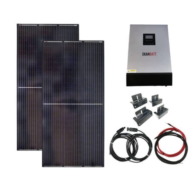 2stkSkanbatt 400W Sorte Mono Solcellepaneler (2020x1000x40mm) 1stk Skanbatt HYBRID inverter 48V 5000VA med 80A MPPT regulator integrert 2stk Festebraketter (enkle til vegg) 1stk 2x50mm2 kabel fra hybrid til batterier (140cm) 1stk 2x6mm2 PV kabel (10m) 1stk MEGA Sikringsholder 1stk MEGA Sikring 250A