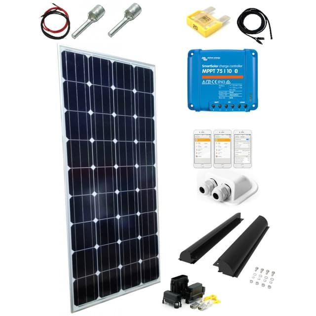 1 stk. Solcellepanel Mono 160w Silver (123x67x30mm ca. 9,04kg) 1 stk. Victron SmartSolar MPPT 75/15 solcelleregulator med blåtann (tåler maks 220w på 12v, maks 75 volt på PV, lader med maks 15A) 1 stk. Sort, dobbelkabelgjennomføring. 1 stk. 2x6mm2 kabel mellom solcelleregulator og batteri ca. 1,8m. 2x6mm2 kabel fra panel til regulator (6m) 1 stk. 20A Maxi bladsikring. 1 stk. Maxisikringsholder. 2 stk. Stiftkabelsko til PV-kabel mot regulator 2 stk. sort aluminiumsfeste med skruer (spoilere)