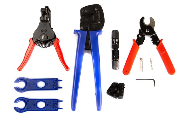 Verktøysett for installasjon av MC4 kontakter opptil 6mm2 i solcelleanlegg. Med dette verktøysettet er du klar for å montere MC4 kontakter på solcellekabel.