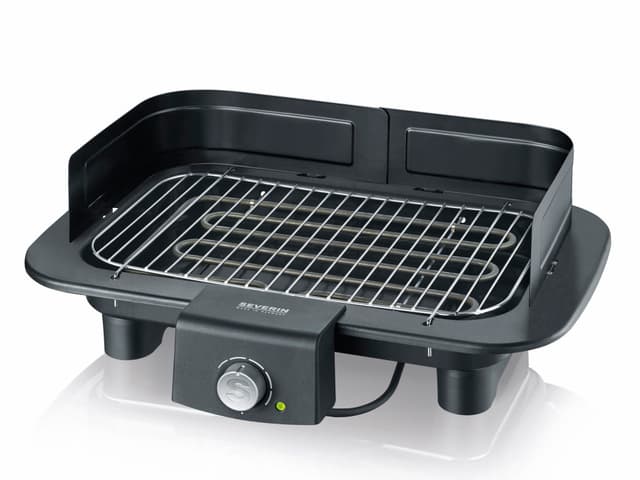 Utendørs elektrisk bordgrill til hagen eller altanen. Fleksibel med ekstra lang ledning (2 m), stor bryter, kontrollys og høyt, avtakbart vindskjold. Det helles vann i bunnen av grillen for å redusere røyk- og luktutviklingen. Ytre mål 50 x 36 x 10 cm, grilloverflate 37 x 23 cm. Lett å demontere og rengjøre. 2300 watt.