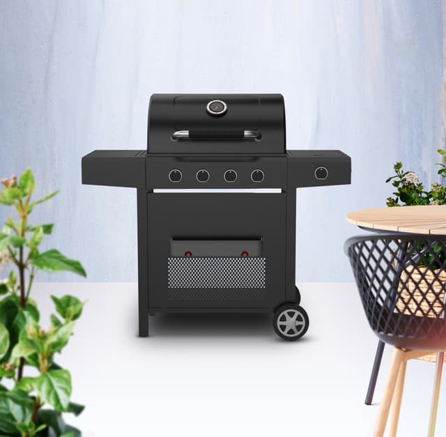 Gassgrill med 4 stk brenner, sidebrenner og innebygd termometer. Grillrist i støpejern med intregrert Grill Flex System. Grillen har 2 praktiske sidebord med plass til tallerkner, grillhansker etc.Les mer om produktet