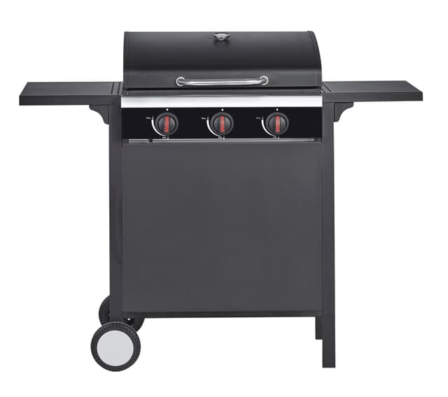 Gasolgrill med 3 brännare à 3,0 kW Mått: 122×57×98 cm Grillyta: 60×42 cm Brödrost: 60×12 cm Rostfri brännare med elektrisk tändning Emaljerat grillgaller med tråddiameter Ø4,5 mm Diffuser i emaljerat stål Svartlackerad front, stativ, lock och sidobord Exkl. regulator och slang Levereras i kartong: 69×58×43 cm Bruttovikt: 21,5 kg