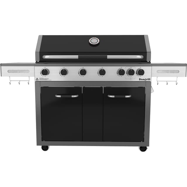 Størrelse: 174,6 x 59 x 114 cm 6 stk. brennere i rustfritt stål SS304, 4 kW/enhet 1 stk. sidebrenner, 2,5 kW/enhet Matlagingsareal: 105,5 x 45,2 cm Grill flex system matlagingsrist i støpejern Varmehylle i emaljert stål Dobbelt lokk i sort emaljert stål Inkludert godkjent regulator og slange Piezo opptenning på hver brenner Grill kassett i emaljert stål 6 stk. flammetemmere i emaljert stål Dangrill termometer i rustfritt stål 2 stk. side bord Runde håndtak med silikon belegg Kontrollpanel i rustfritt stål Drypbakke Innebygget flaskeåpner Inkludert redskapskroker 4 stk. gummihjul