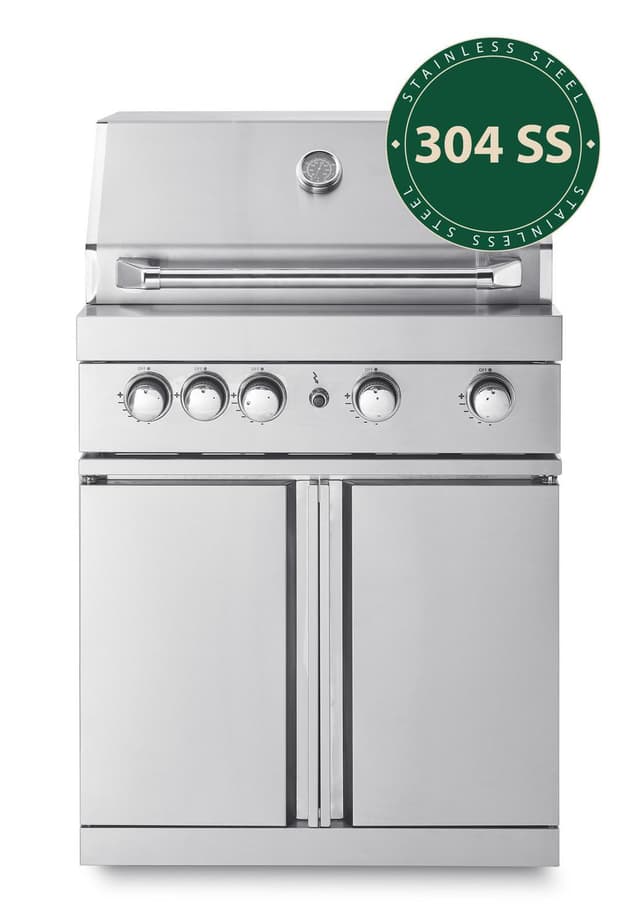 Gassgrillen har fire hjul og kan plasseres overalt i hagen eller på uteplassen. Dessuten er den utstyrt med elektrisk Piezo-tenning som gjør at du kommer raskt i gang med grillingen. Brennere, flametamers, fettoppsamlingsskål, grillrist og varmholdingsrist der alle detaljer er fremstilt i rustfritt stål 304 SS for beste kvalitet. Dobbeltsidig lokk med temperaturmåler og håndtak i rustfritt stål. Lokket har et utvendig og innvendig lag rustfritt stål med luftspalte imellom, noe som gjør grillen bedre isolert så den holder bedre på varmen, samtidig som lokket ikke blir for varmt å ta på og ikke representerer en brannfare.