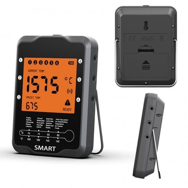 Trådløs Kjøttermometer med BluetoothEn funksjonell, effektiv og praktisk kjøttermometer med Bluetooth-funksjon! Nå slipper du å gå inn på kjøkkenet hver gang du vil kontrollere temperaturen på kjøttet, du kan i stedet ta med deg displayet ut til Tv-sofaen og slappe av mens displayet holder øye med deg. Du setter enkelt sonden i kjøttet og kobler den til displayet via Bluetooth. Produktet har ulike funksjoner som for eksempel påminnelsesfunksjon, timer og veksling mellom temperaturmoduser. Det inkluderer 2 sonder i pakken.