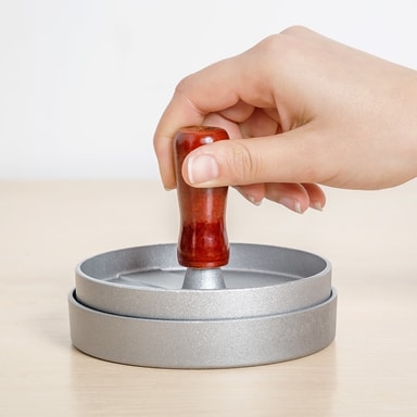 Med hamburgerpressen kan du raskt forme pene og jevnstore hamburgerbiffer. Et must for enhver burgerfantast.