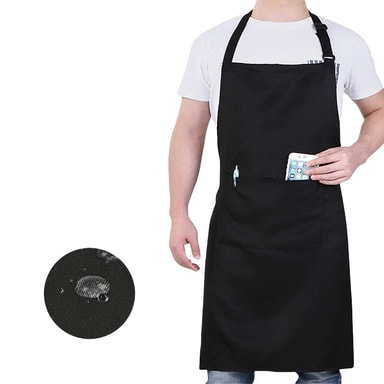 Vann- og oljeavvisende: Dette svarte arbeidsforkleet er laget av et vannavvisende og oljeavvisende materiale som effektivt hindrer væsker og fett i å trenge inn. Dette sikrer at klærne dine holder seg rene mens du jobber på kjøkkenet, på en grill eller i andre rotete miljøer.