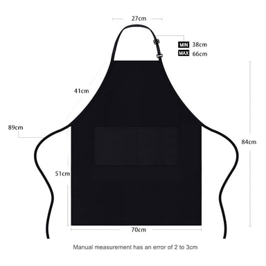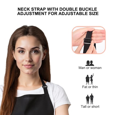 Justerbar nakkestropp: Nyt en komfortabel og tilpasset passform med den justerbare nakkestroppen. Denne funksjonen lar deg justere lengden på forkleet og passer personer med forskjellige høyder og nakkestørrelser. Stroppen kan justeres opp til en maksimal omkrets på 66 cm.