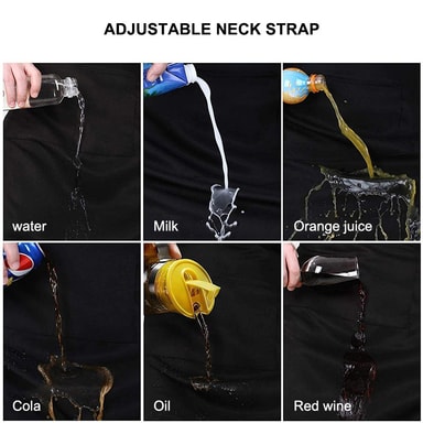 Vann- og oljeavvisende: Dette svarte arbeidsforkleet er laget av et vannavvisende og oljeavvisende materiale som effektivt hindrer væsker og fett i å trenge inn. Dette sikrer at klærne dine holder seg rene mens du jobber på kjøkkenet, på en grill eller i andre rotete miljøer.