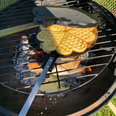 Vaffeljern Bakels i solid støpejern holder lenge på varmen, og har et ekstra langt stål- og trehåndtak perfekt for bruk over bålpannen eller bålet.
