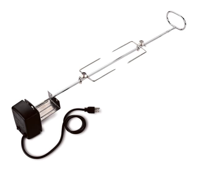 Settet inneholder spyd, gafler, motor og omformer til 220V og kan brukes på Weber Spirit gassgriller.
