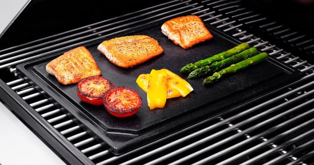 Universell stekeplate med slippbelegg tilpasset de fleste gassgriller og rektangulære kullgriller på markedet. Overflaten er laget av stein og har et slippbelegg som enkelt kan rengjøres med varmt vann. Plasseres direkte på grillristen ved bruk. For å beskytte slippbelegget bør du alltid bruke redskap av plast eller treverk. Passer utmerket til grilling av fisk, kjøtt, pizza, egg og bacon.