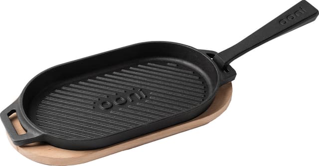 Forsegle inn smaken på kjøtt og grønnsaker med Ooni Grizzler panne i støpejern 48221036 som kommer med de distinktive markeringene av en grillpanne, et avtakbart håndtak og et inkludert serveringsbord i tre.