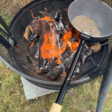 Sprettkønndigel er en praktisk popkorngryte som er perfekt til bruk over bålet. Skaftets lengde kan justeres, slik at den er enkel å ha med på turen. Selve håndtaket er i god urnorsk tradisjon, produsert i tre slik at det ikke blir varmt å holde.