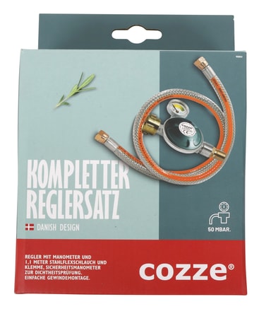 Cozze® regulator med manometer for lekkasjetest og 110 cm stålflexslange. Enkel montering med ¼""-gjenger.
