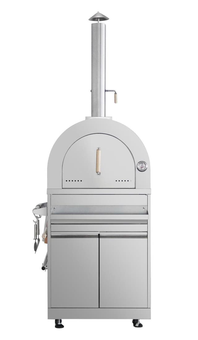 Frittstående modul med vedfyrt pizzaovn i rustfritt stål. Bruk utekjøkkenet til mer enn bare å grille - invester i en pizzaovn som gjør at du kan oppleve gleden ved å jobbe med mat og åpen ild på nye og spennende måter. Skjem bort nære og kjære med utsøkt pizza direkte fra den vedfyrte pizzaovnen. For å gjøre opplevelsen komplett leveres pizzaovnen med tilbehør som pizzaspade, pizzaskjærer og rengjøringsbørste som kan festes til høyre eller venstre for grillen.